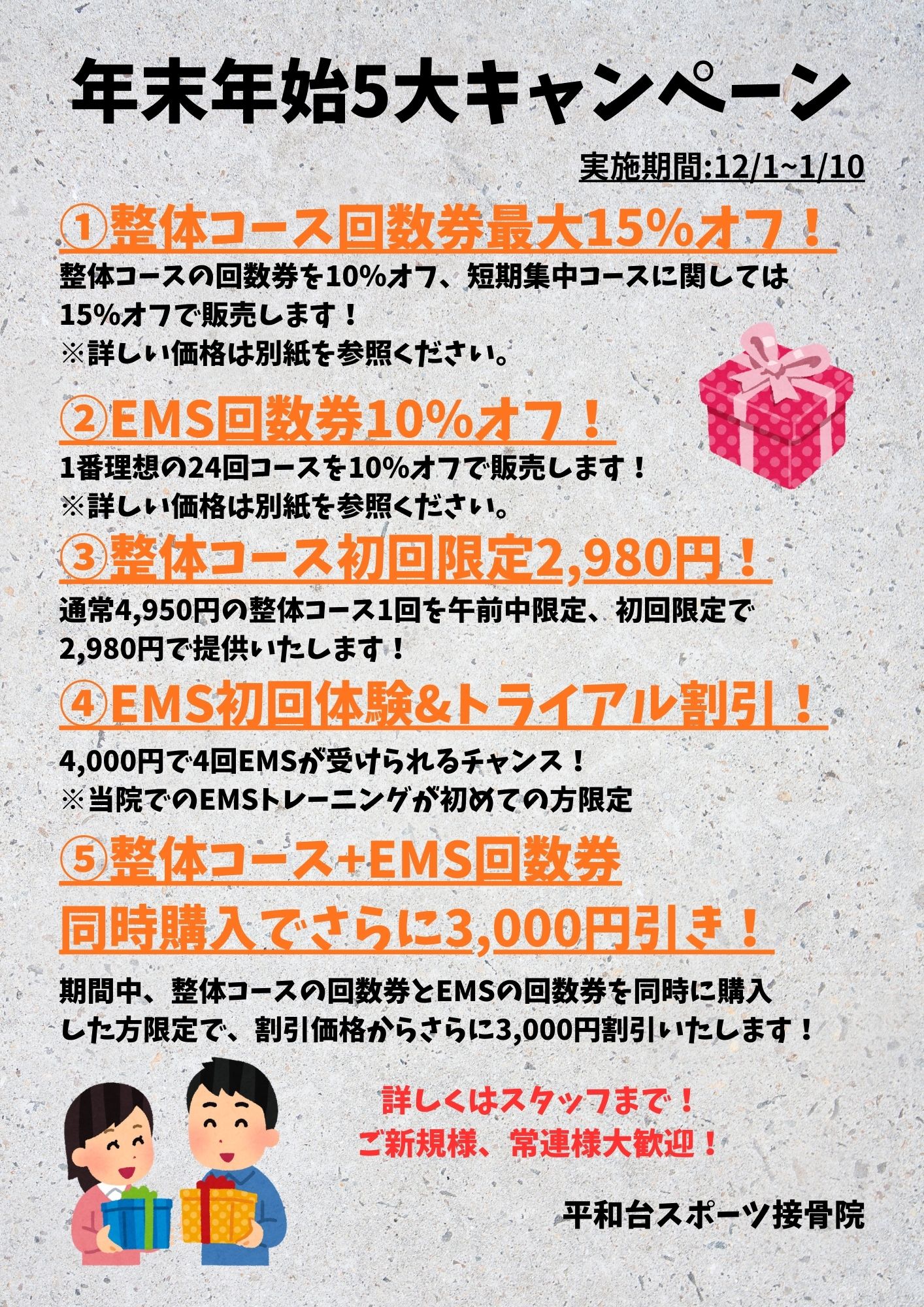 当整骨院では、12月1日から1月10日までの期間限定で、年末年始5大キャンペーンを行うことになりました!